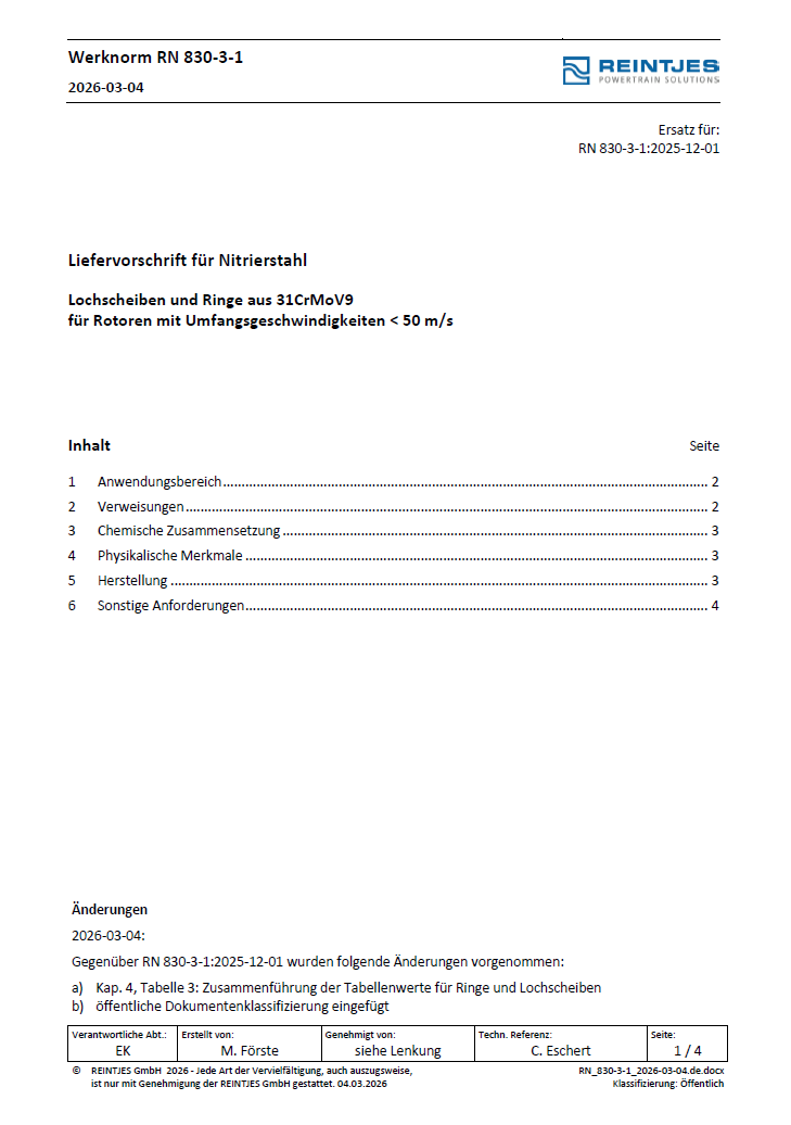 RN: 830-3-1: Liefervorschrift für Nitrierstahl Lochscheiben und Ringe aus 31CrMoV9 für Rotoren mit Umfangsgeschw. < 50 m/s