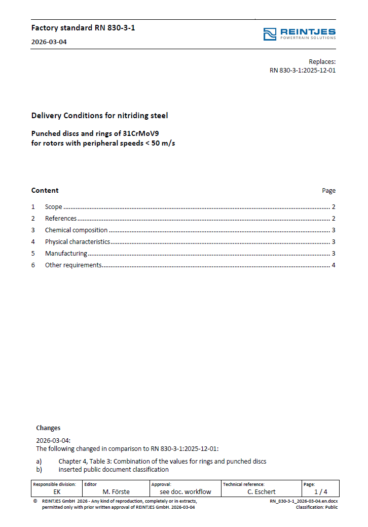 RN 830-3-1: Delivery Conditions for nitriding Steel; Punched Disks and Rings of 31CrMoV9 for Rotors with peripheral Speeds < 50 m/s