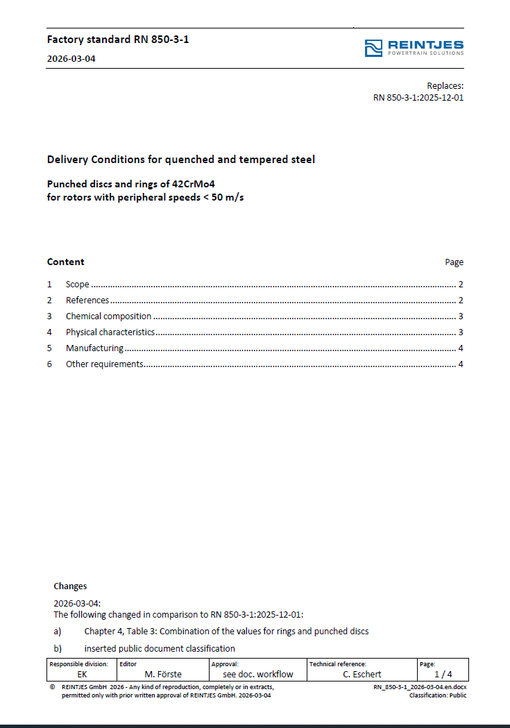 RN 850-3-1: Delivery Conditions for quenched and tempered Steel; Punched Disks and Rings of 42CrMo4 for Rotors with peripheral Speeds < 50 m/s